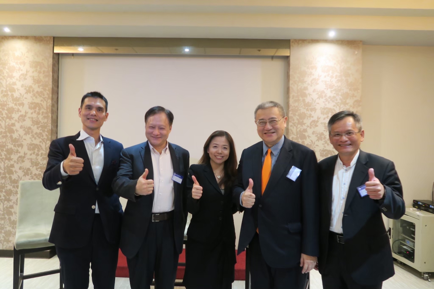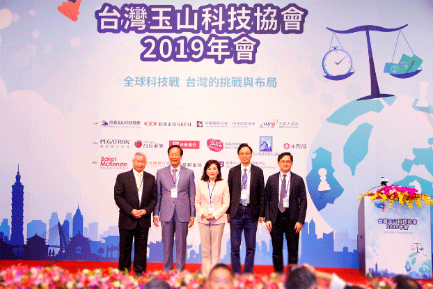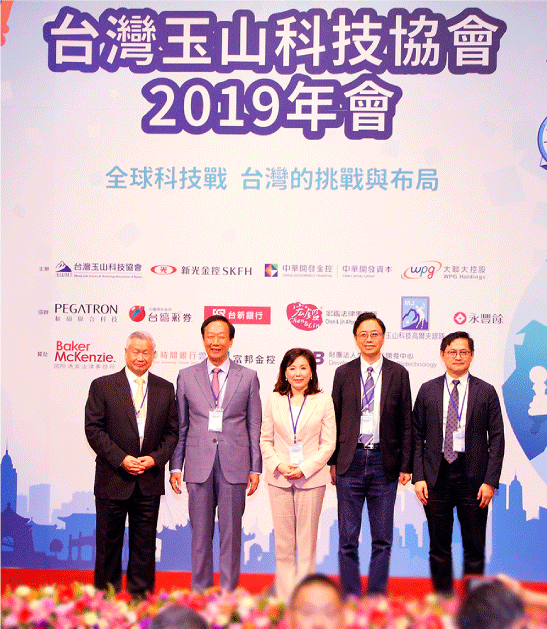 台灣玉山科技協會本屆年會貴賓雲集,左起旺宏電子吳敏求董事長、鴻海創辦人郭台銘先生(左二)、玉山科技協會李紀珠理事長(左三)、前行政院長張善政先生(右二)、和碩聯合科技童子賢董事長(右一)