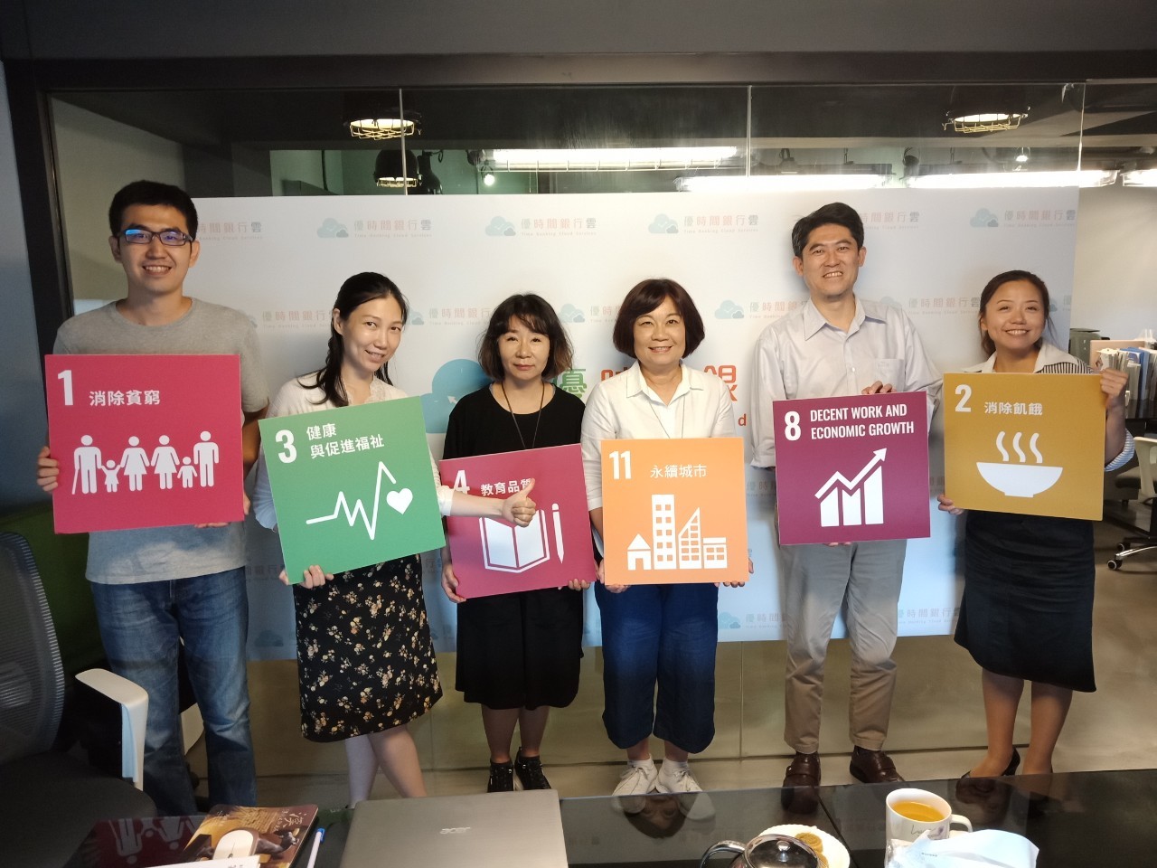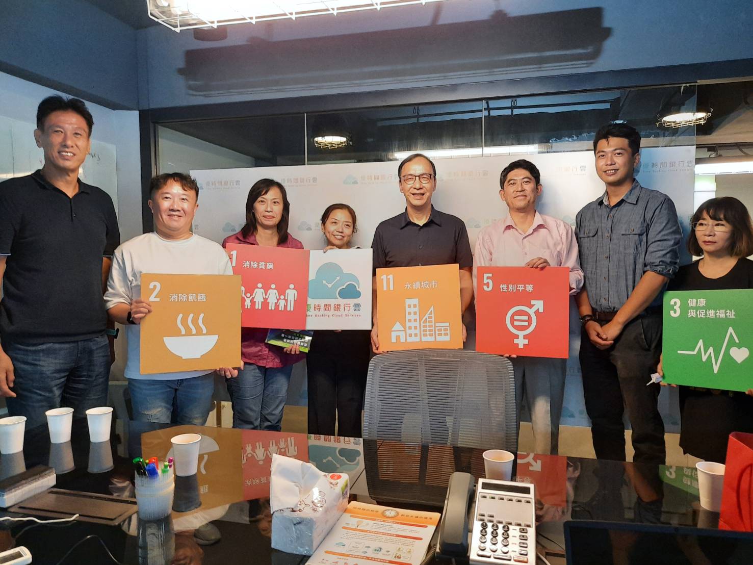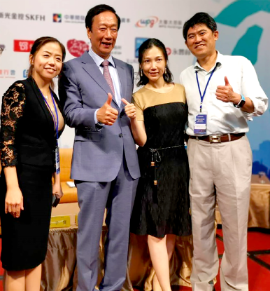 鴻海創辦人郭台銘先生(左二)、優護平台股份有限公司陳宏益董事長(右一)、優時間銀行雲林倩如總經理(左一)、優時間銀行雲業務經理許雅惠(左三)